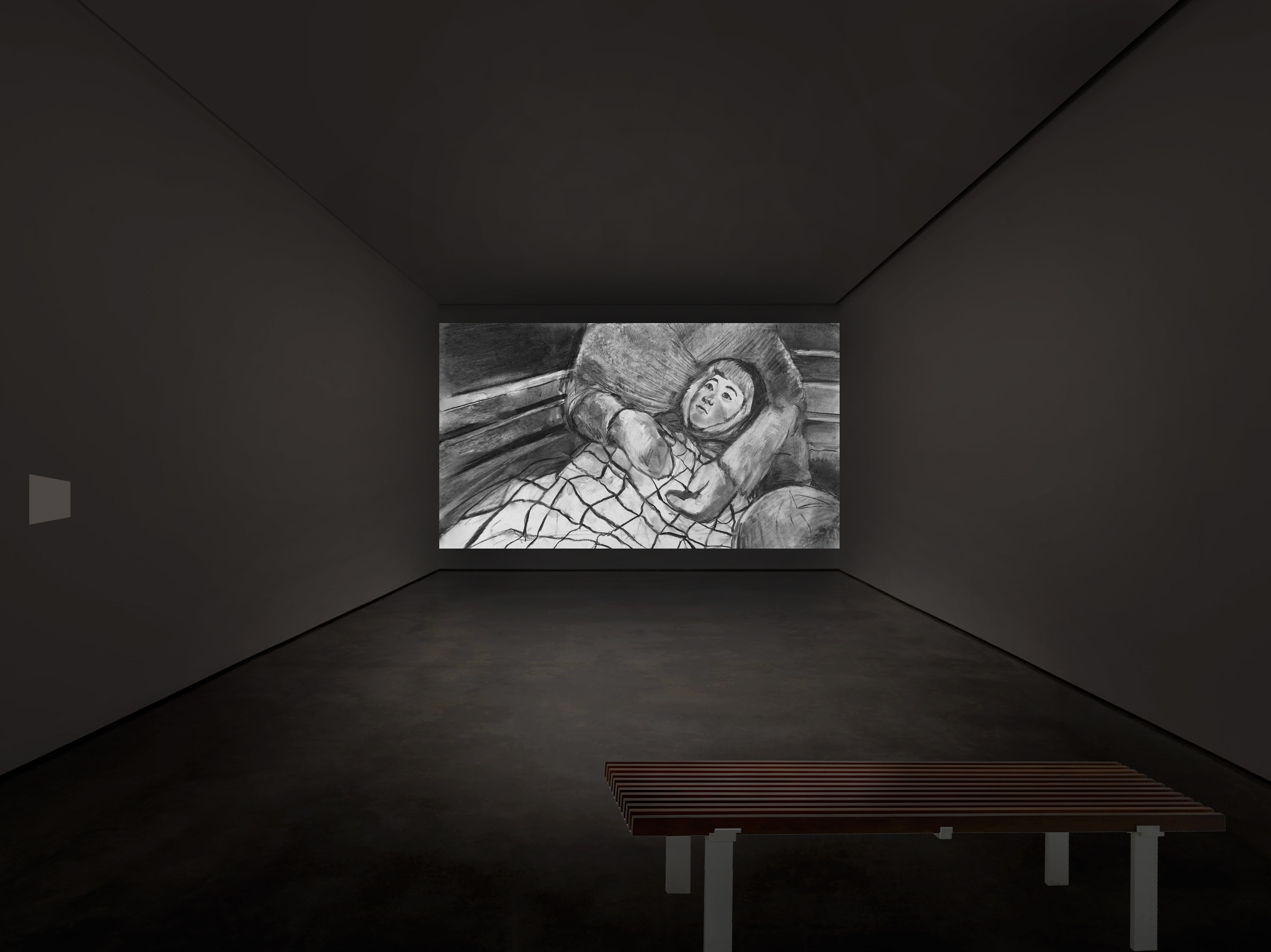 ..In her hand-drawn animated film All the Dreams We Dream (2017-2020), the artist draws on childhood memories of travelling through the famine-ridden steppes that she has discovered in rare memoirs referencing the famine. Making drawings from their words exposes the artist herself to the traumatic horror she is bringing into visibility. Evocatively animated, the film takes us too on a journey over the deserted steppes in snowy moonlight, entering emptied yurts to encounter shocking, almost indecipherable chimaeras created by starvation, clothed now in the compassion of her aesthetic wit(h)nessing.